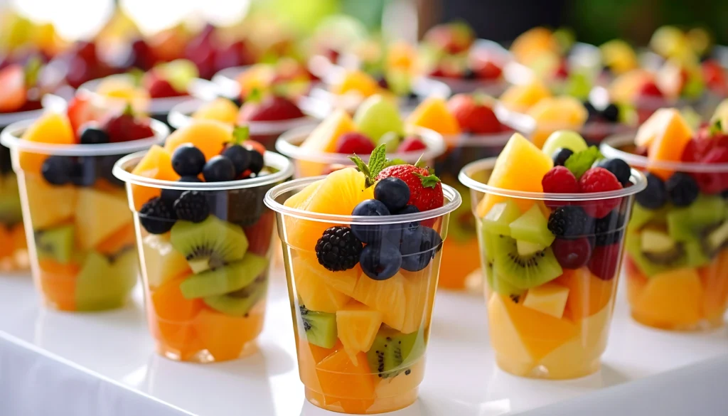 - In clear cups or small bowls, layer the fruit in rainbow order: strawberries (red), oranges (orange), pineapple (yellow), grapes (green), blueberries (blue/purple).